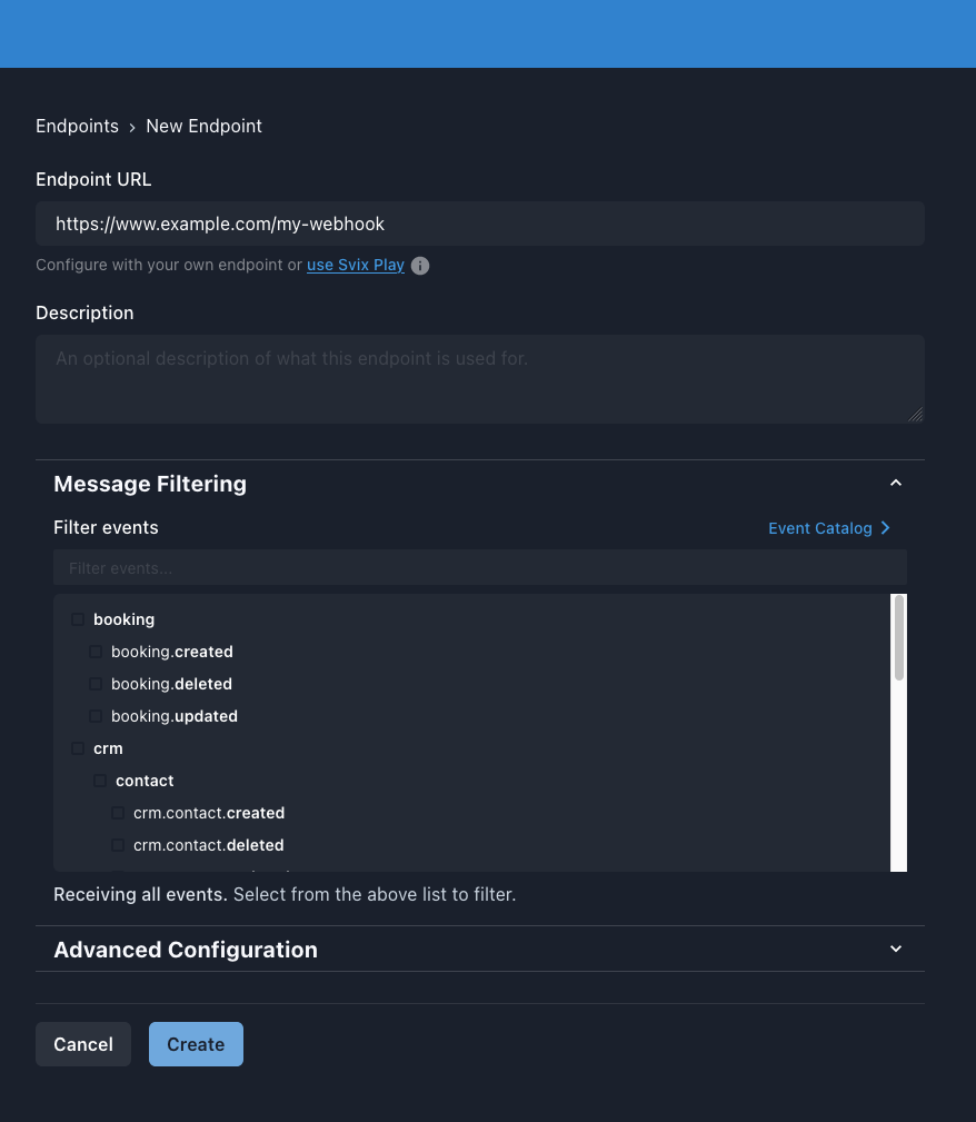 Using the create webhook flow you will be able to configure which events your webhook should receive, as well as whether you want to add any custom headers such as adding auth to your endpoint.
